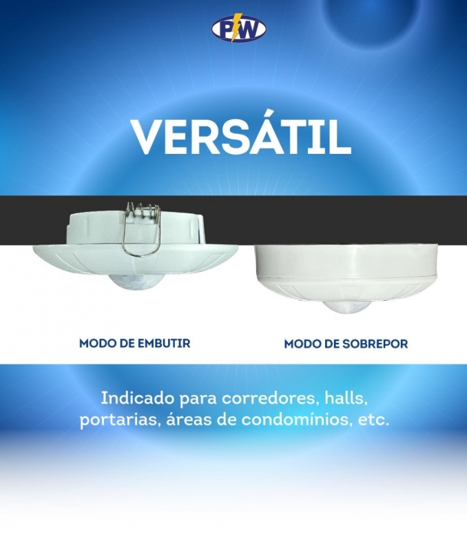 Desenvolvido para acender a iluminação do ambiente quando detecta o movimento de alguém. Modelo 2 em 1, pode ser usado para embutir em forro ou sobrepor. este modelo não possui fotocélula